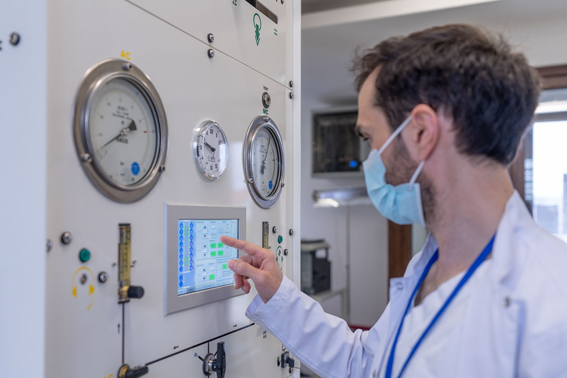 DECOMAT este o unitate automatizată de compresie care reglează automat presiunea din cameră pentru a permite o experiență de tratament mai confortabilă. DECOMAT reduce rata de barotraumă la nivel ORL sau toracic cu cca.67%.